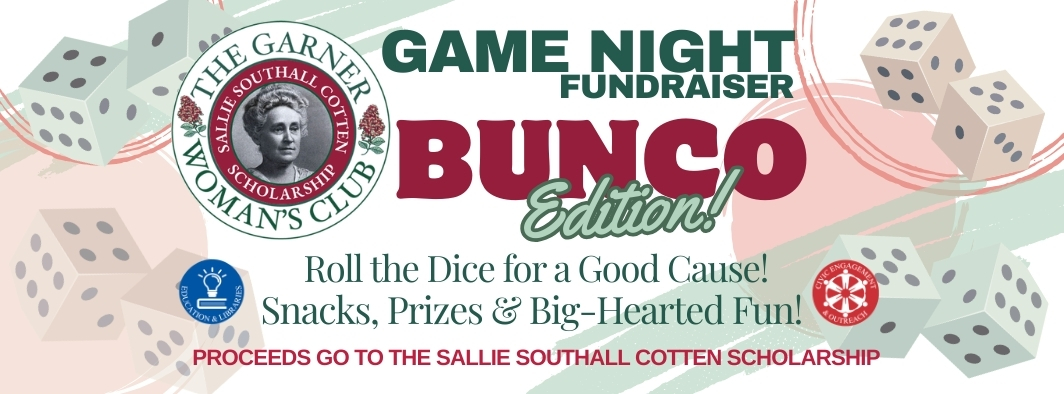 The Garner Woman’s Club invites you to an evening of fun, fast-paced dice, and feel-good giving at our GWC Game Night Fundraiser: BUNCO Edition! Whether you’re a seasoned roller or a first-timer who barely knows what BUNCO is (don’t worry—we’ll teach you!), this is your chance to connect with neighbors, enjoy some laughs, and support a worthy cause.